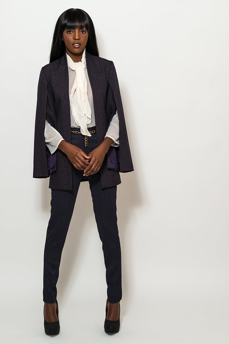 Make a statement with our chic blazer featuring open cut cape sleeves, adding a modern twist to a classic silhouette. Paired with a white sheer pussybow blouse and skinny pants, this ensemble exudes sophistication and style. Elevate your fashion game with this fashionable and trendy outfit for a polished and on-trend look!