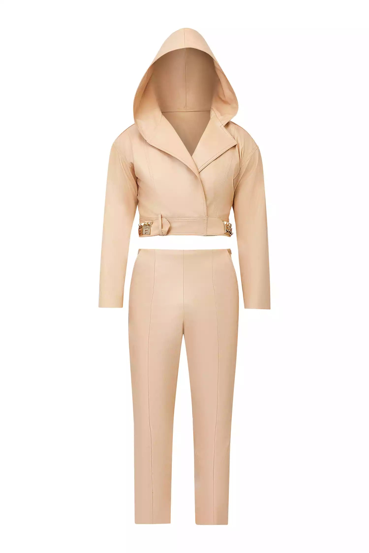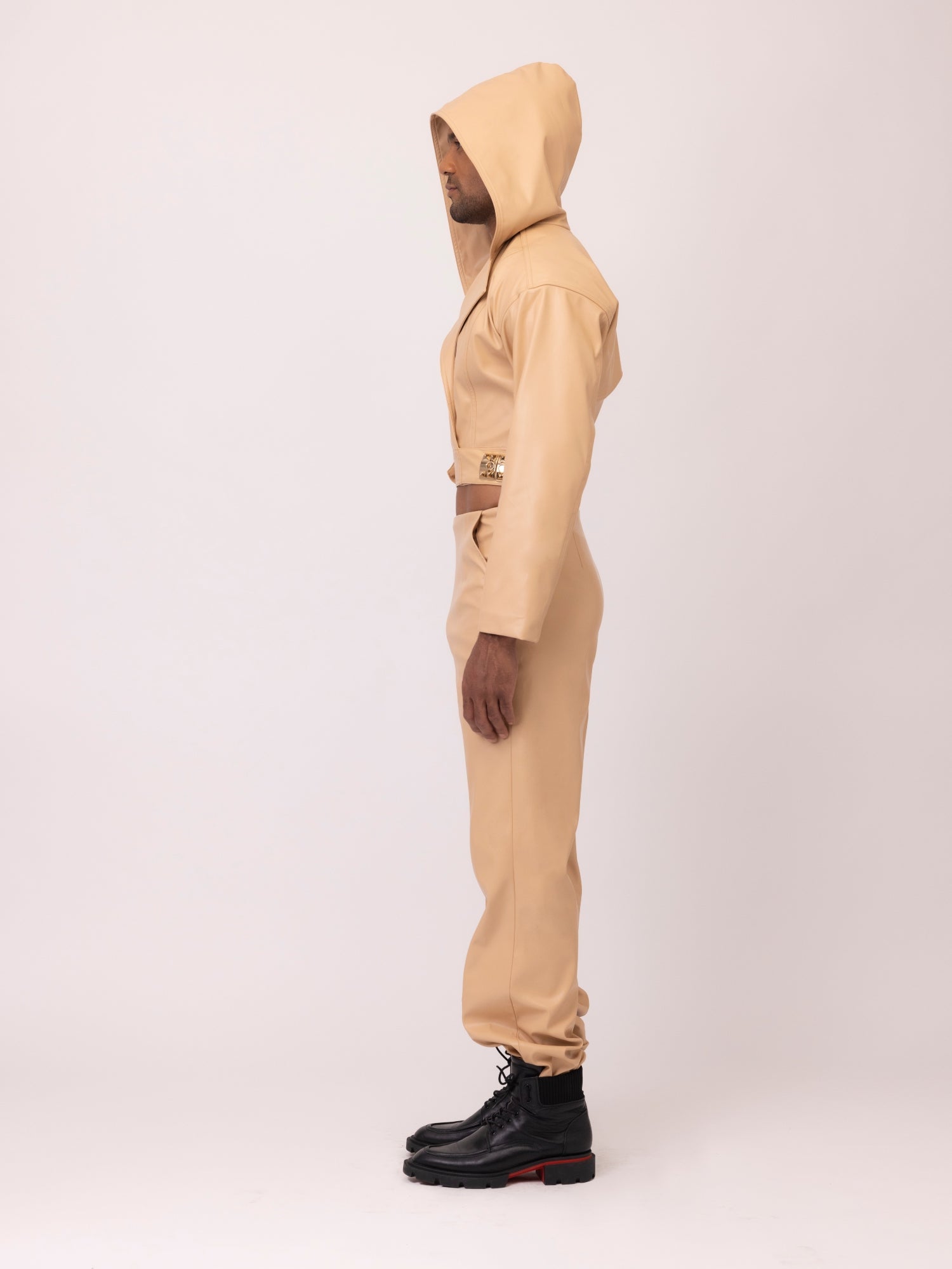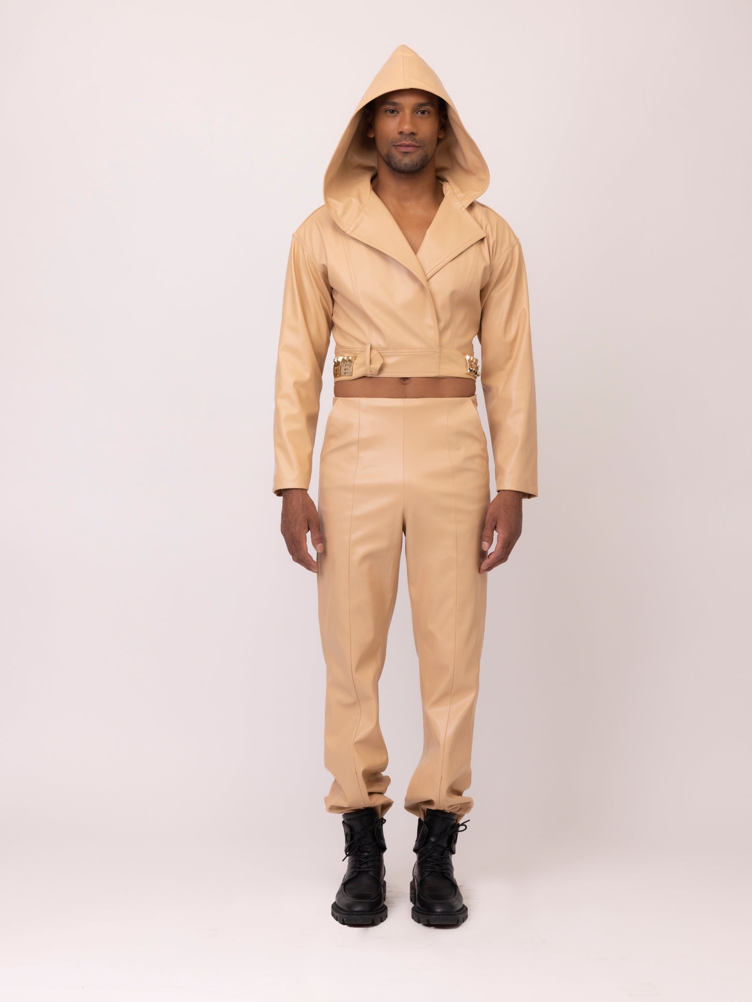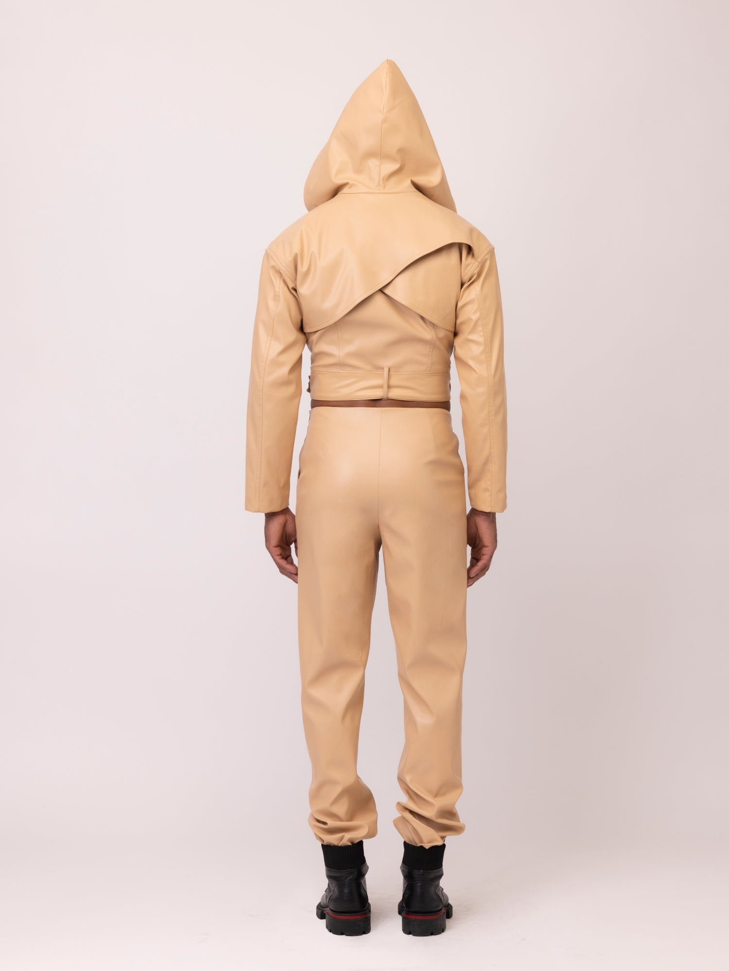 Our Peter Crisis Two Piece focuses on sustainably elevating your fall wardrobe, one matching set at a time. Designed to inspire growth, this earthy tone set is crafted from cactus vegan leather and is unisex. The top features an exaggerated collar with an attached hood while the bodice is framed with long sleeves and a crop silhouette, completed with a banded waist.