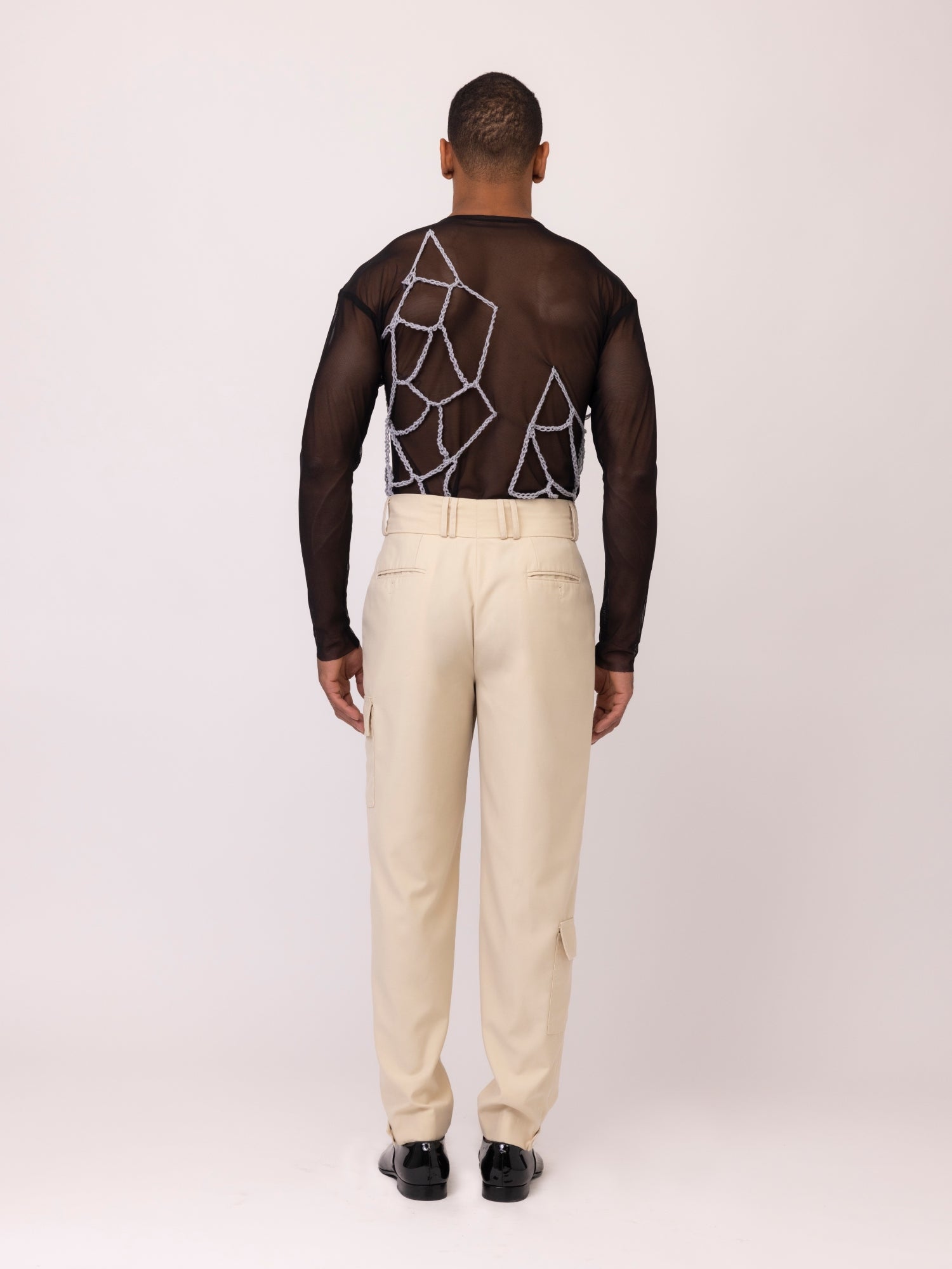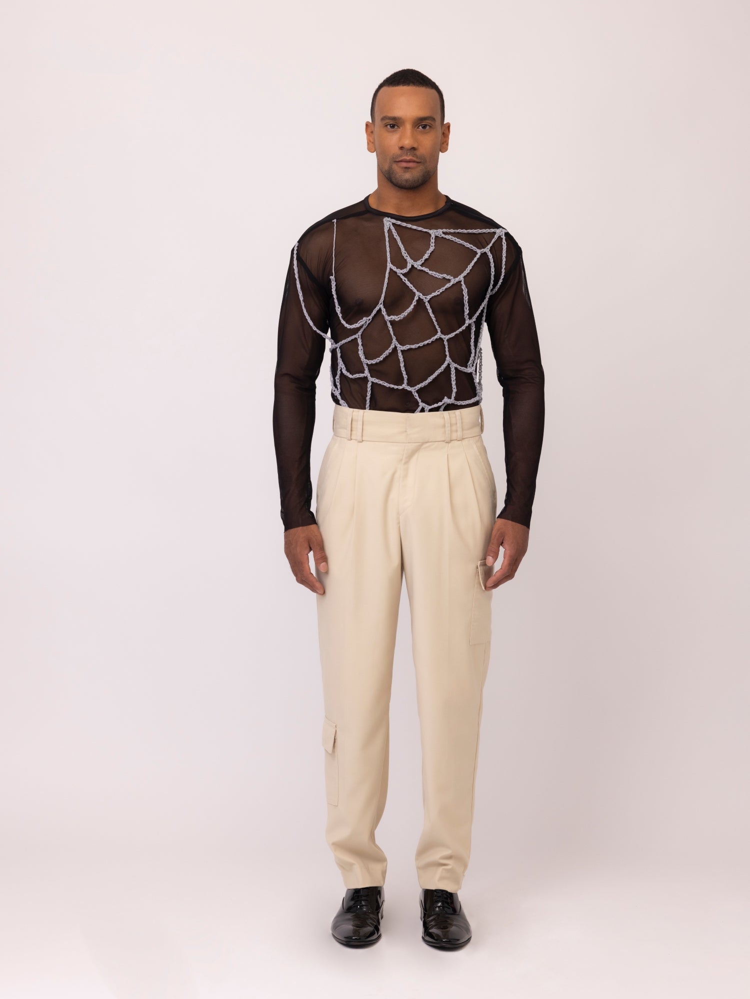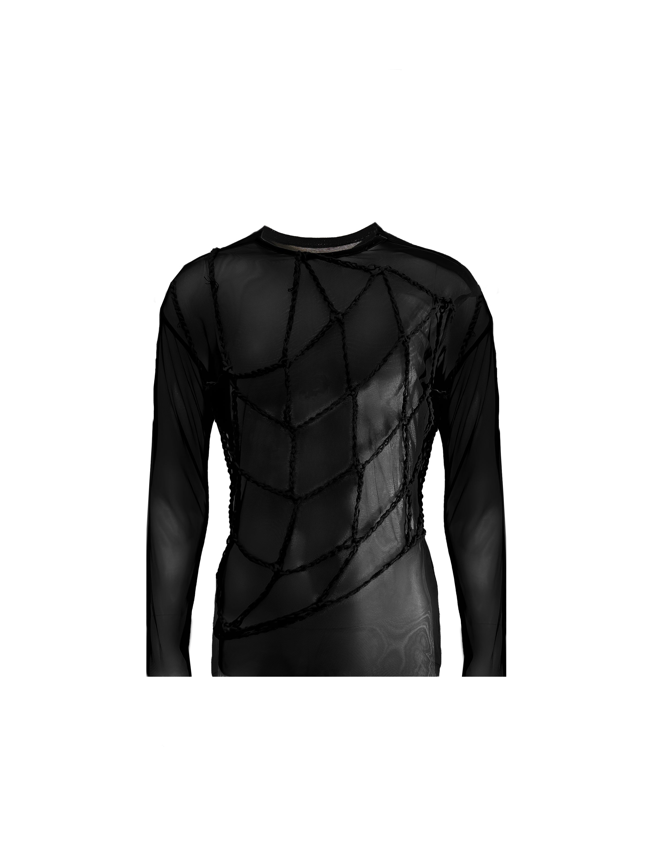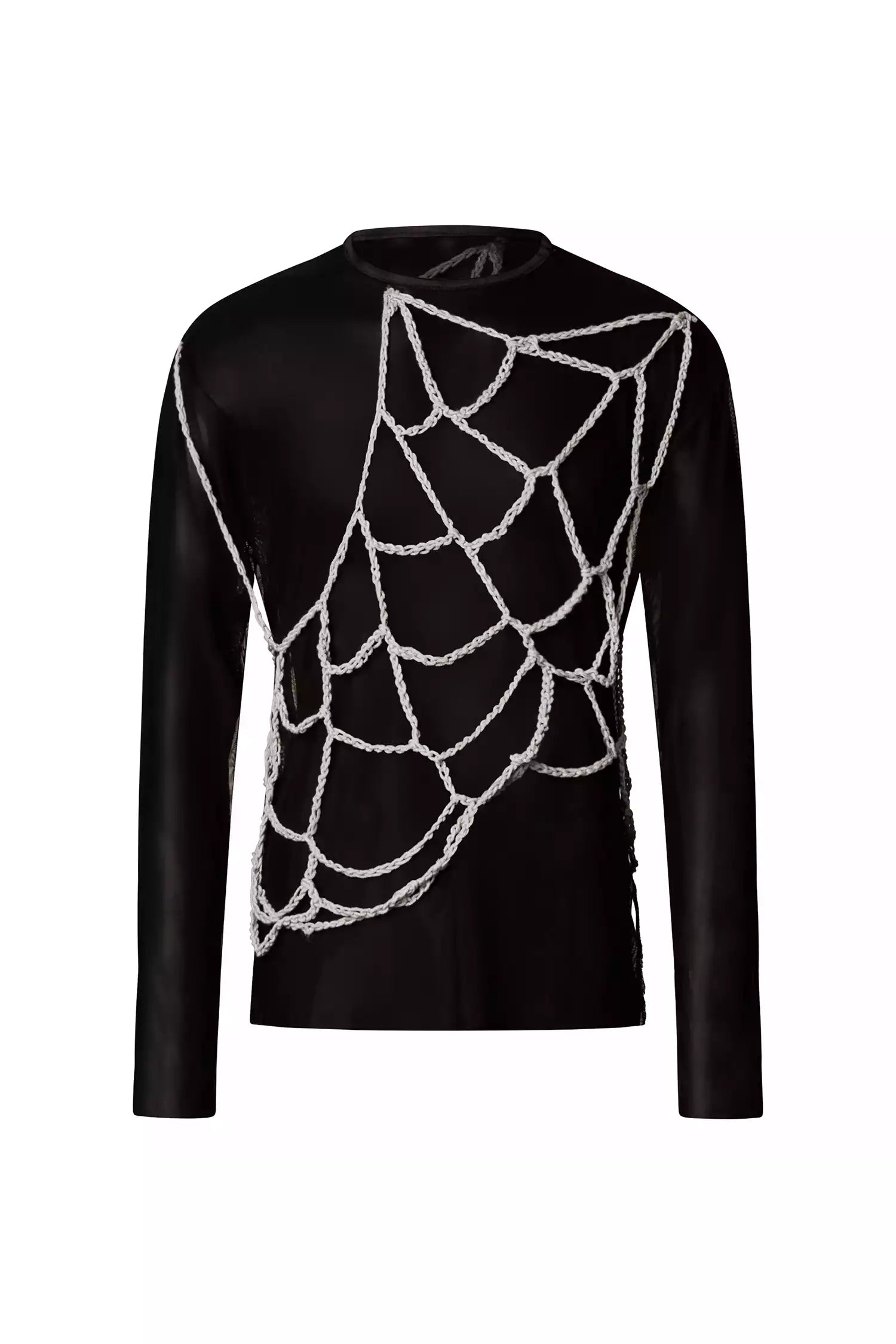 The Rod Stweart men’s t-shirt depicts the brand’s creativity with its standout style, showcasing a sheer bodice with a body-hugging fit, classic crew neck with side neck zippers and long sleeves. Sustainably crafted from mesh with hand crocheted wool knitting, the contrast webbing really sets this style apart from the rest.